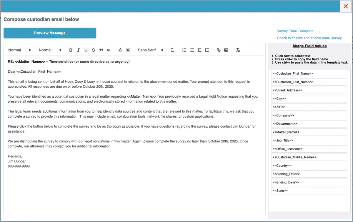 - Create and send custodian surveys and reminders directly from Evidence Optix, simplifying outreach to custodians and tracking of responses.