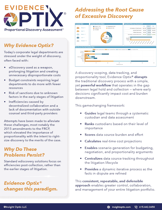 Legal practitioners need a comprehensive, transparent, defensible method to make proportionality arguments. Evidence Optix® takes this from a concept to an actionable process.