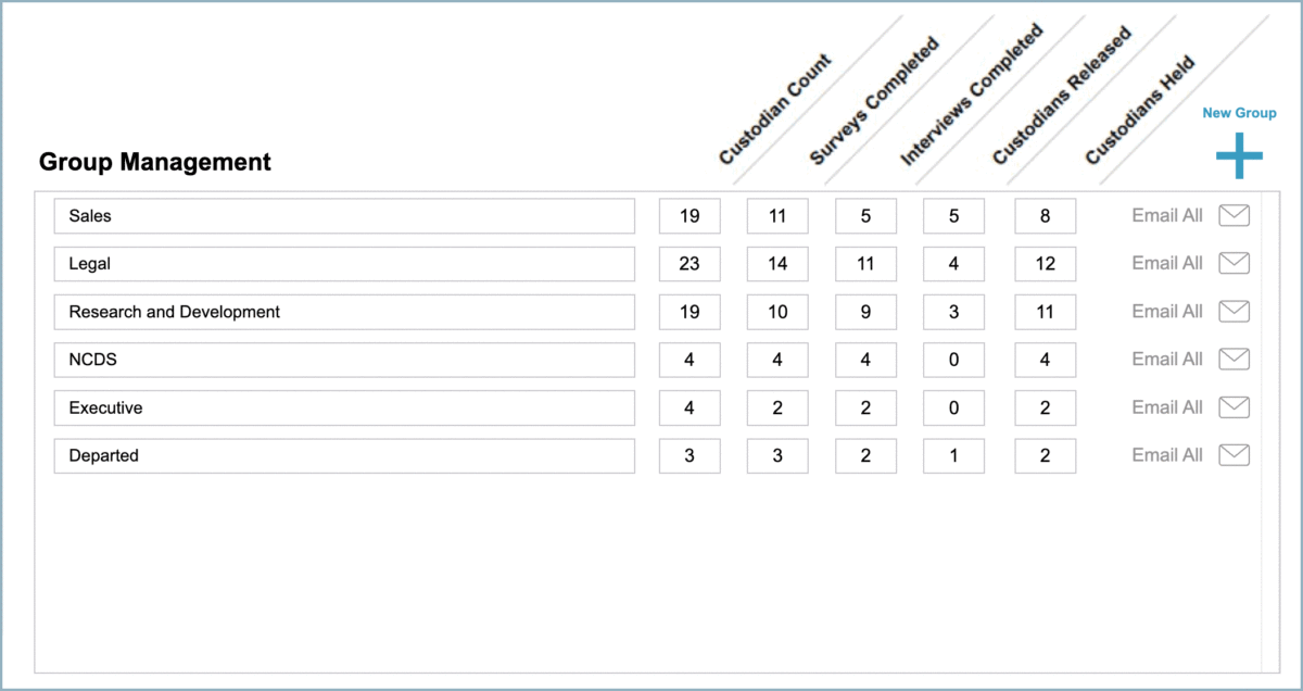 - Segment Custodians (e.g., by department, non-custodial, executive, departed, priority level) and assigned tailored surveys, relevancy assessments, and interviews to capture specific relevant responses that facilitate faster and more precise analysis.